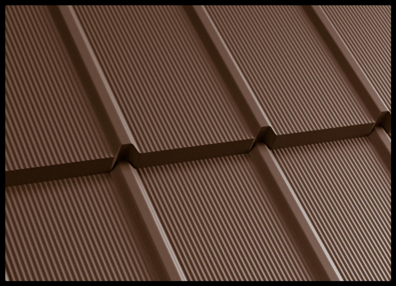 Она уникальна благодаря своему оригинальному дизайну, полученному в основном благодаря использованию многочисленных профилирований. Первое, что бросается в глаза — это трапециевидные формы, отделяющие плоские части панели. Благодаря им на крыше создается характерный рисунок «шоколадных плиток», который выглядит «целостно» на крыше. Металлочерепица TIGRA, кроме трапециевидного ребра, имеет дополнительное нано-профилирование. Такое решение уже используется нами для профилирования кровельных фальцевых панелей. Профилирование волн металлочерепицы ТИГРА настолько небольшие, что издалека они выглядят как ровная поверхность, но одновременно укрепляют панель, улучшая ее жесткость. Длина тайла 350 мм.
