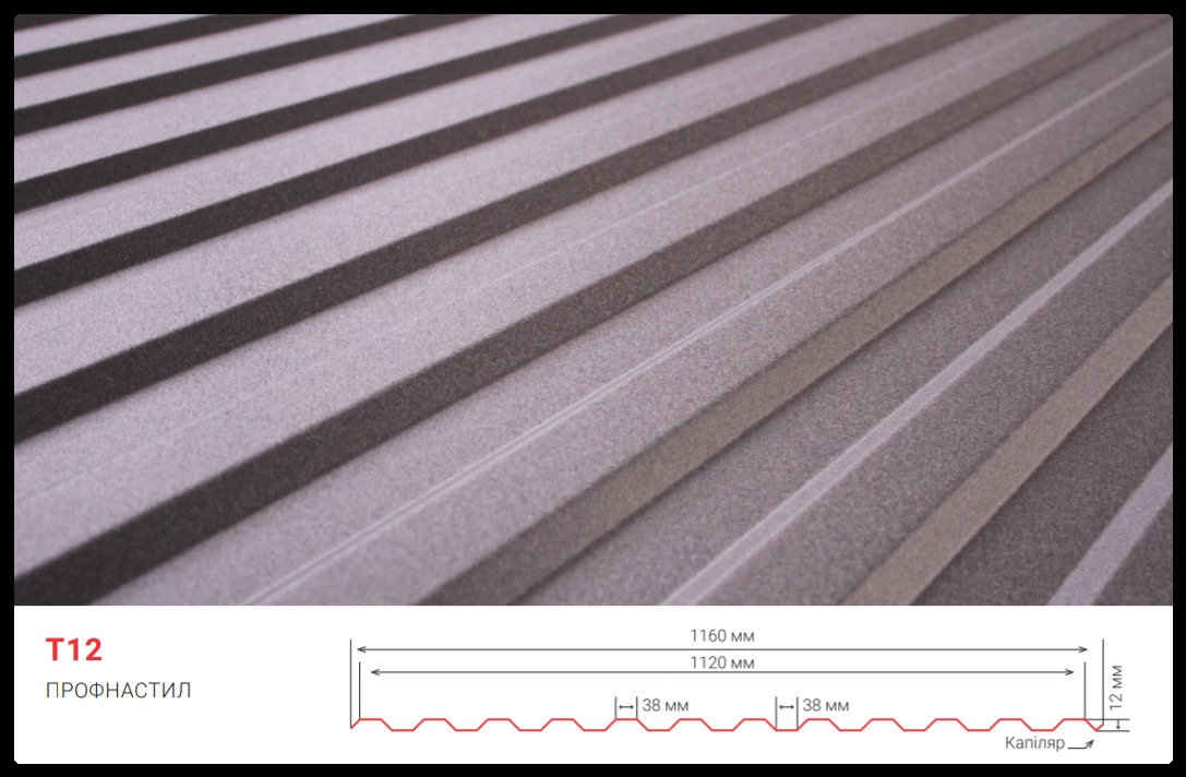 Металопрофіль Т12 — цей вид профнастилу є універсальним, він може слугувати як для паркану так і для покрівлі маленьких будівель та облицювання зовнішніх та внутрішніх стін і стель вашого приміщення.